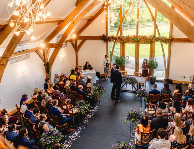 The venue has three dedicated spaces—the Ceremony Barn, the stunning Oak Reception Barn, and the Grain Store for relaxed drinks and mingling. Mythe Barn also offers on-site accommodation and a luxury bridal suite, making it a one-stop wedding destination. It’s perfect for couples who want to seamlessly move from “I do” to dancing the night away.